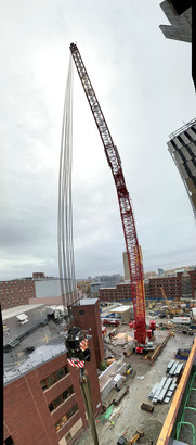 All 10 massive girders have now been installed on the 7th floor of the MIT – Site 3 project. The Girders were erected with a 1600 ton crawler crane! Girders weigh 180,000 lbs each and were fabricated in Supermetal's Sherbrooke, QC plant.
